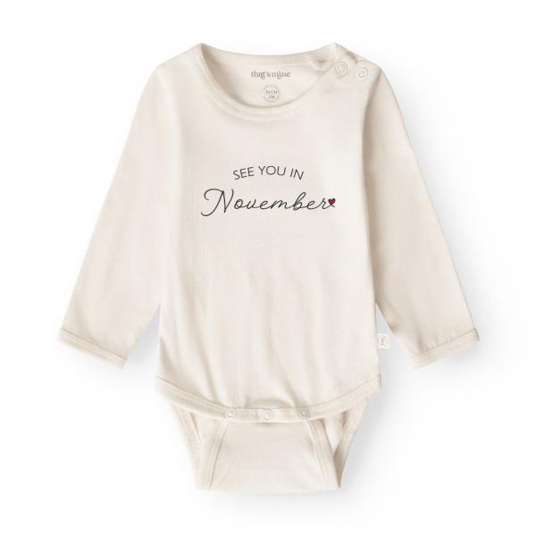 Obi Bodystocking See You In November fra That’s Mine er en fantastisk måde at dele den glædelige nyhed om en kommende ankomst. Denne bodystocking er ikke bare et tøjstykke, men en sød overraskelse til bedsteforældre, familie og venner.